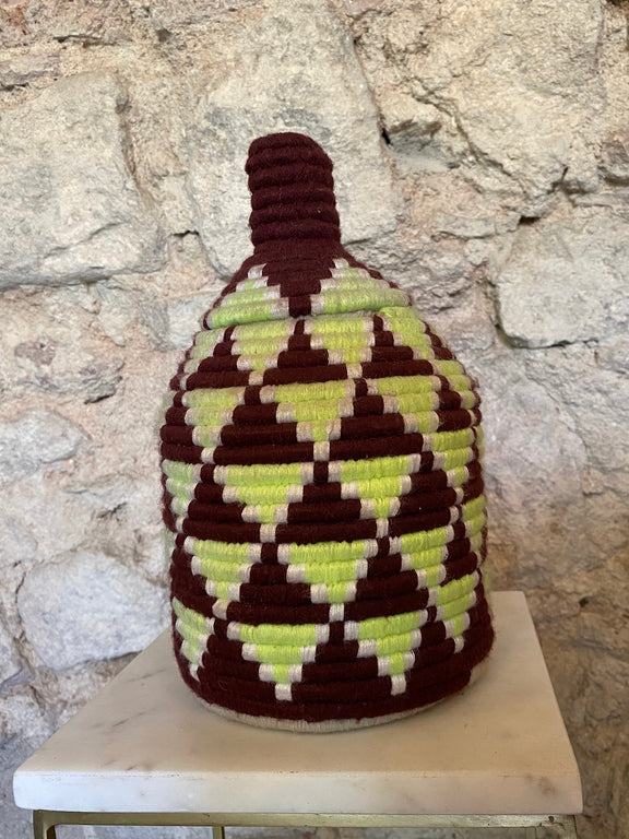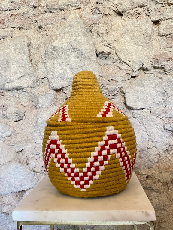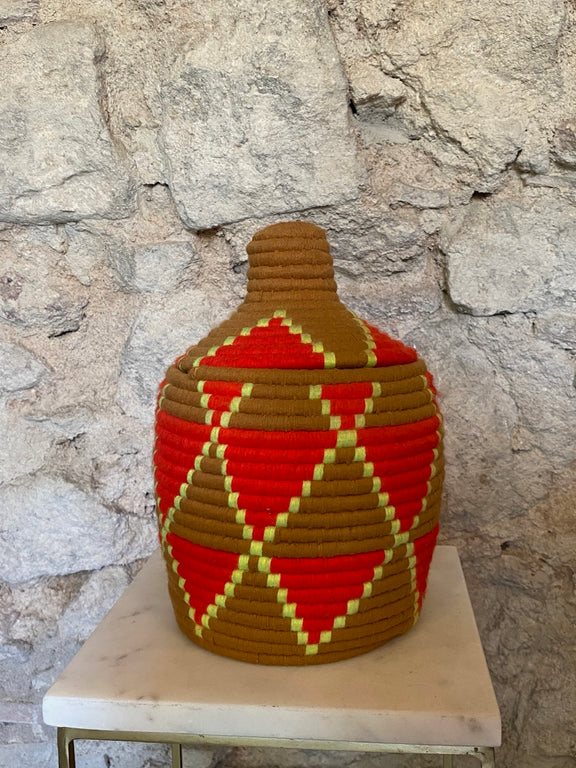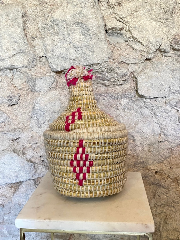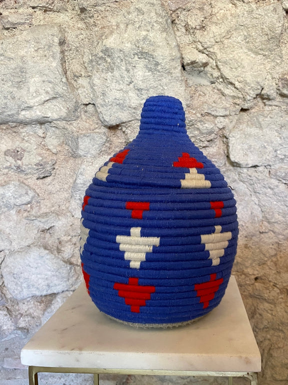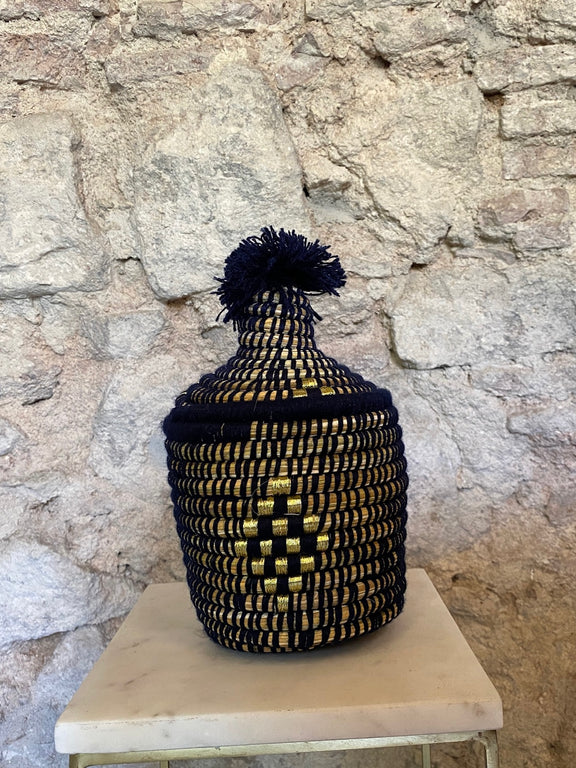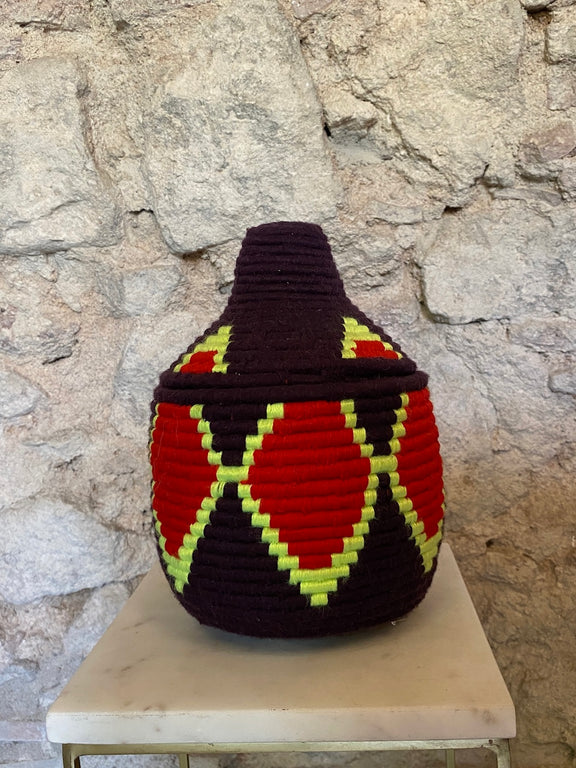 Todas estas cestas están tejidas a mano por nuestros artesanos en la región de Essaouira, Marruecos, utilizando fibra de rafia y lana.