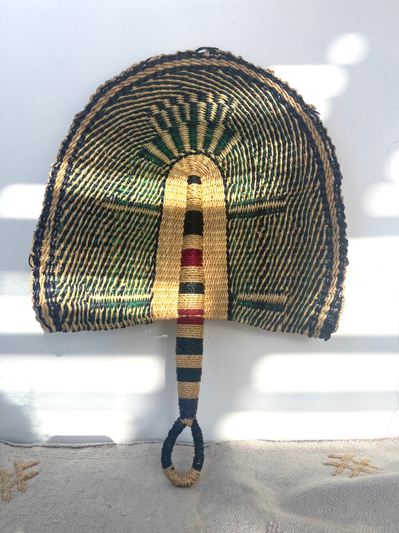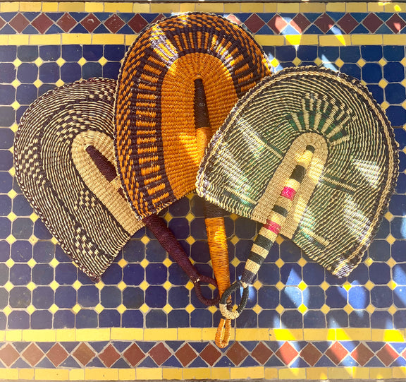 Estos abanicos los hemos encontrado durante nuestro viaje, pero vienen de Malí y están tejidos a mano.