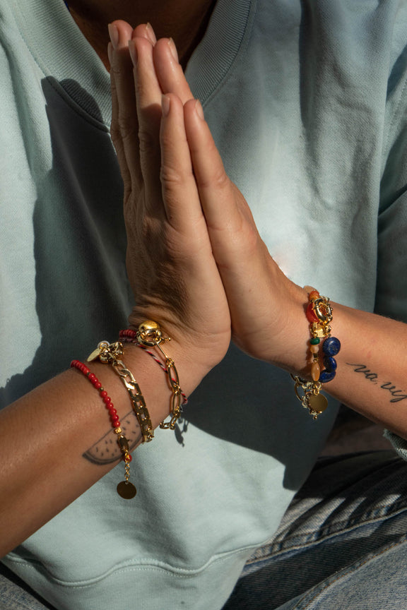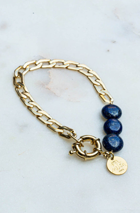 Le bracelet BLUE MOON est créé à partir d'une chaîne en laiton plaquée or et de pierres lapis lazuli d'Afghanistan.