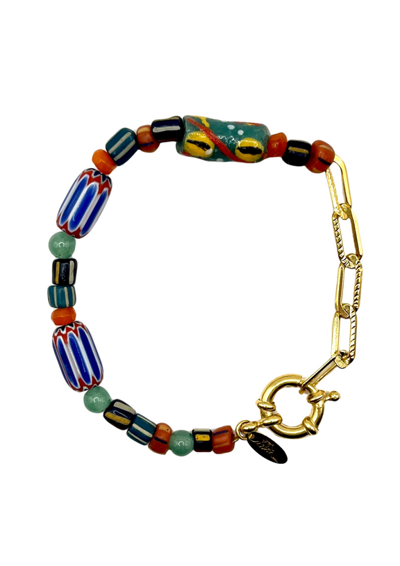 Le bracelet GHANA est créé à partir d'une chaîne en laiton plaquée or et de perles en verre recyclé puis peintes à la main au Ghana.