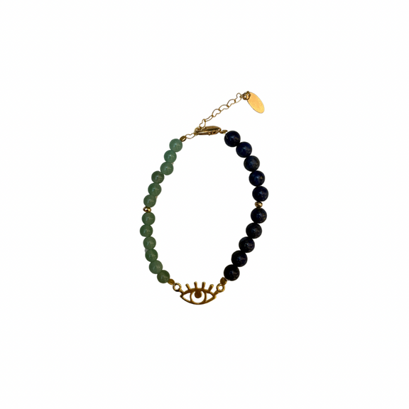 Le bracelet MUNDUK est créé à partir de lapis lazuli et de jade, et d'un pendentif représentant l'oeil moulée en argent par un artisan balinais puis plaqué or à Paris.