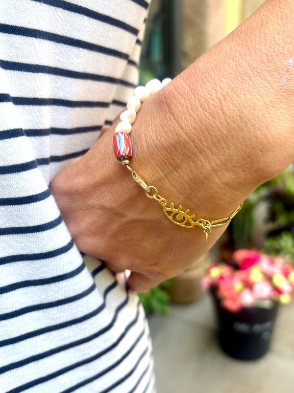 Le bracelet NUSA est créé à partir de vraies perles de l'île de Lombok, d'un oeil en plaqué or crée par notre artisan bijoutier balinais et d'une perle de verre recyclée du Ghana car nous aimons mélanger les horizons :)