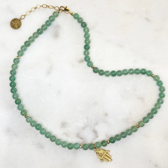 Le collier CANGGU est créé à partir d' Aventurine et d'une main de Fatima moulée en argent par un artisan balinais puis plaqué or à Paris.