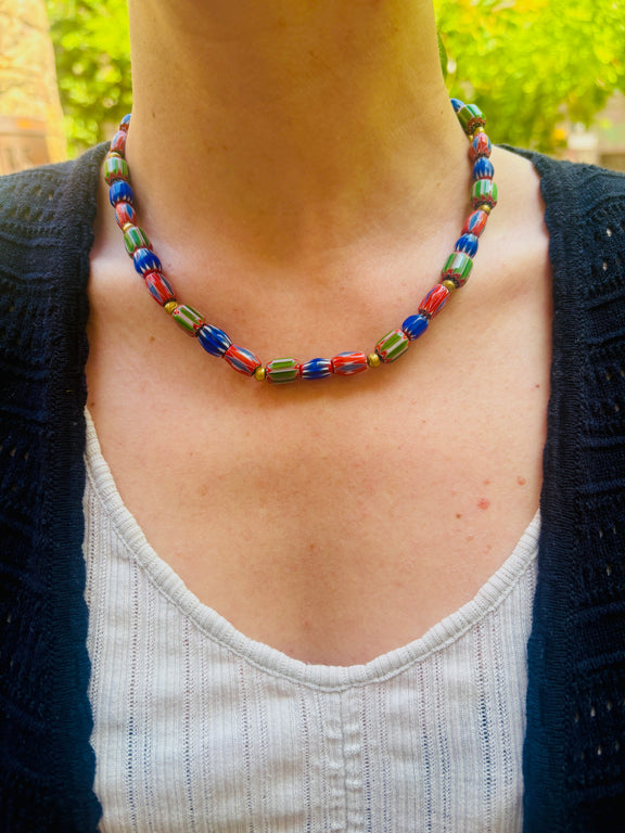 Le collier GHANA est créé à partir d'une chaîne en laiton plaquée or et de perles en verre recyclé puis peintes à la main au Ghana.