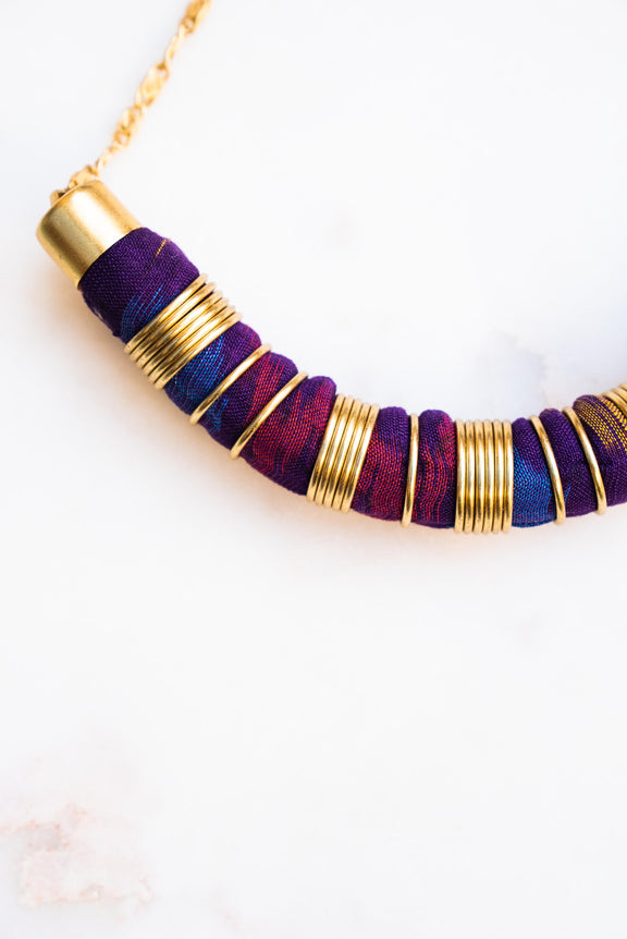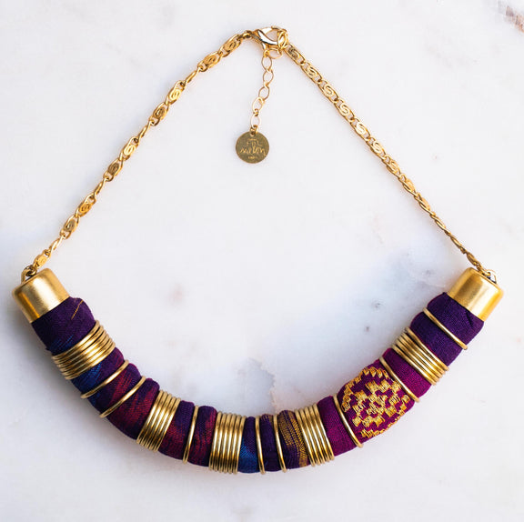 Le collier PACHAMAMA BALI est créé à partir d'un Batik ou endek indonésien tissé ou imprimé artisanalement, puis monté dans notre atelier à Barcelone.