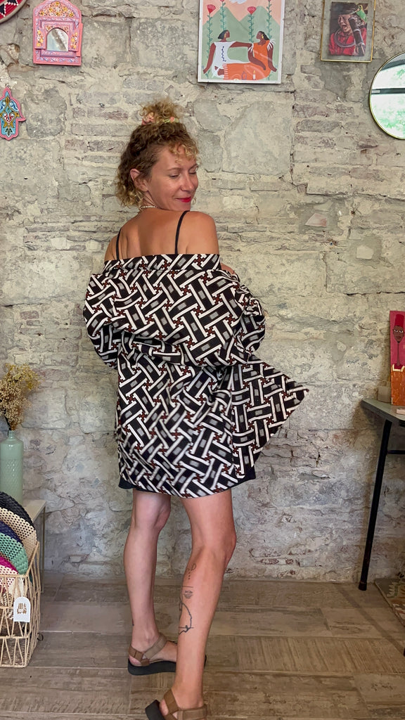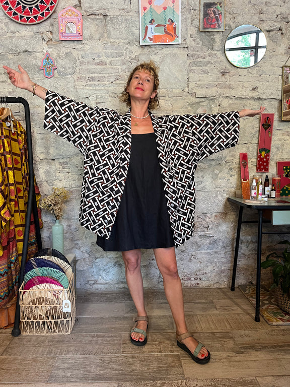 Le kimono UBUD est en coton et est réalisé par notre couturier à Bali à partir de Batik traditionnels indonésiens.