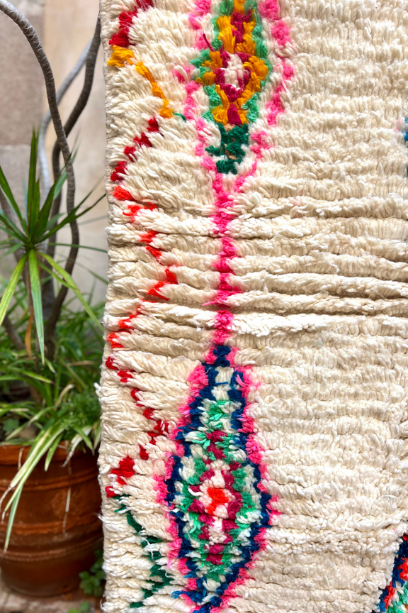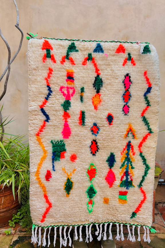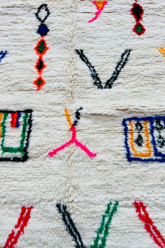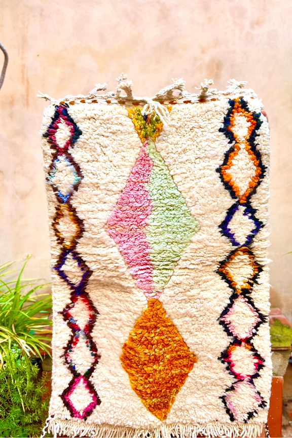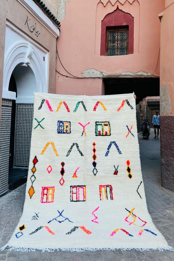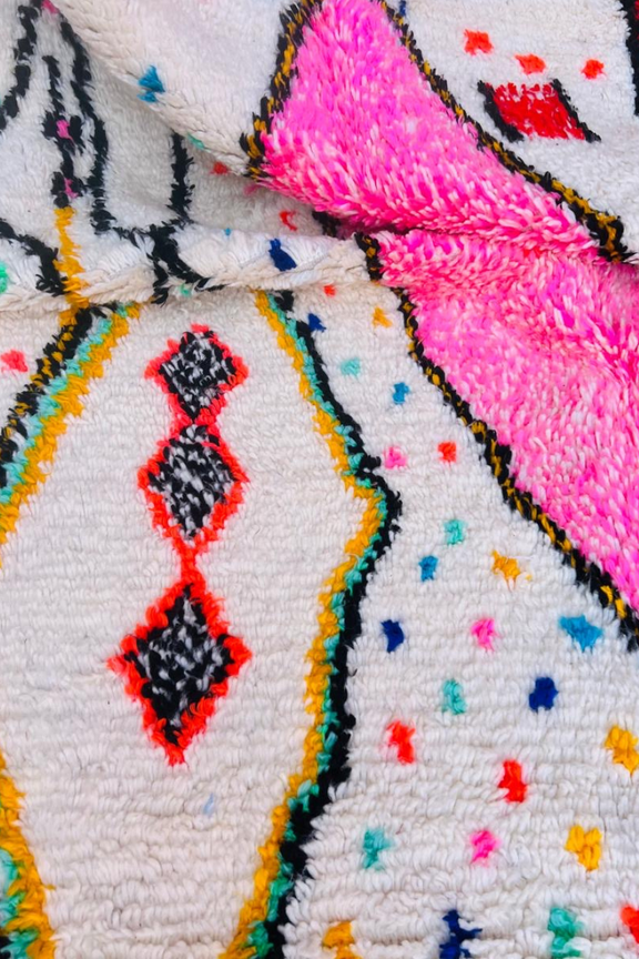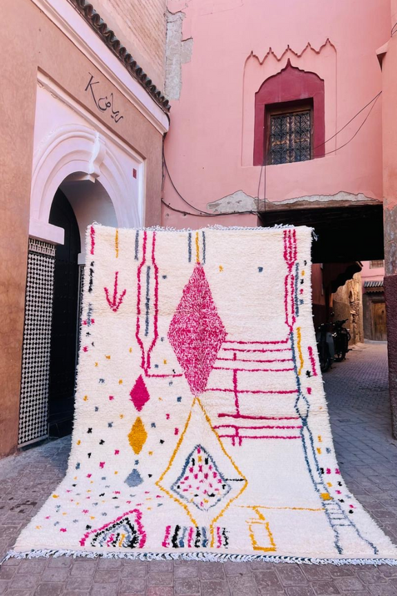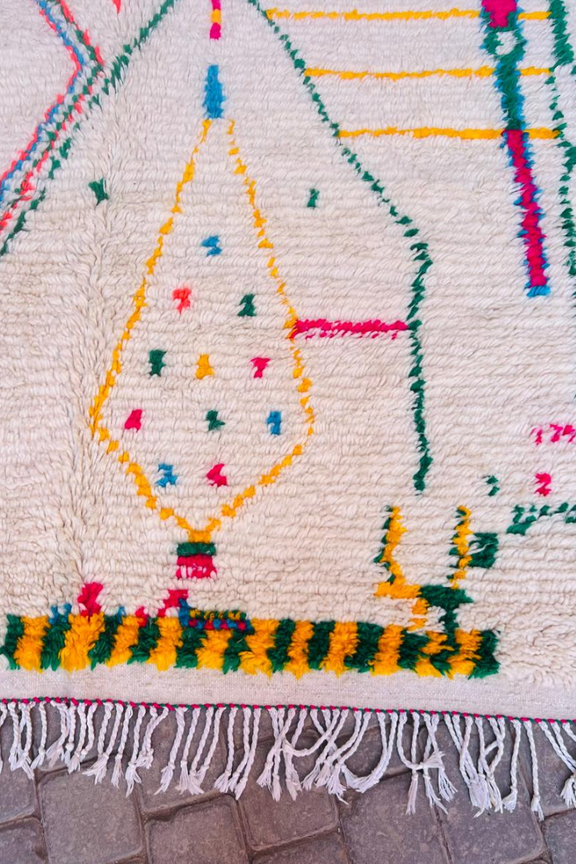 Ce qui distingue les Azilal, ce sont leurs motifs abstraits et colorés, dessinés par les tisseuses qui racontent leur histoire à travers symboles berbères comme le zigzag (voyage), les pyramides (appartenance) ou les triangles inversés (fêtes).